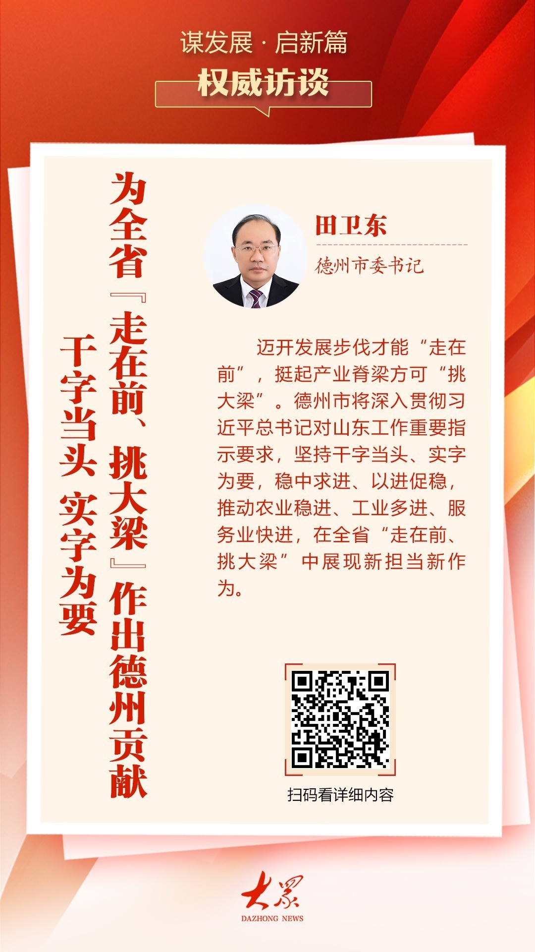迈开发展步伐才能“走在前”,挺起产业脊梁方可“挑大梁”。德州市将深入贯彻习近平总书记对山东工作重要指示要求,坚持干字当头、实字为要,稳中求进、以进促稳,推动农业稳进、工业多进、服务业快进,在全省“走在前、挑大梁”中展现新担当新作为。
